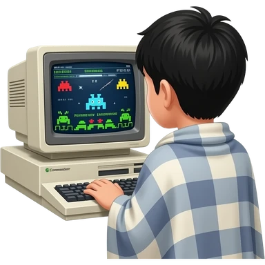 一个中国小男孩,披着一条毛毯,背对着一台 commodore vic-20 在使用电脑,屏幕上是 space invader游戏 emoji