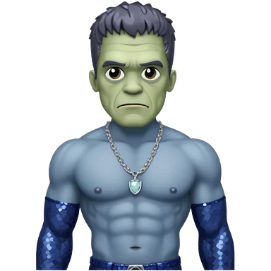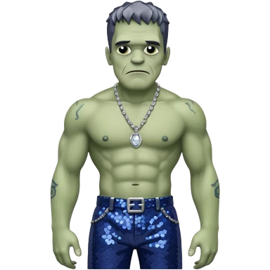 Frankenstein with grey skin, indigo sequin baggy pants, shirtless with necklace emoji