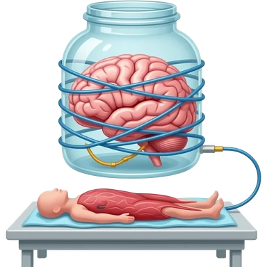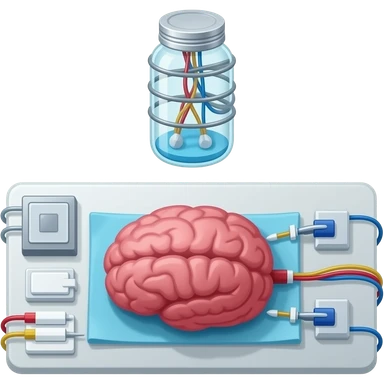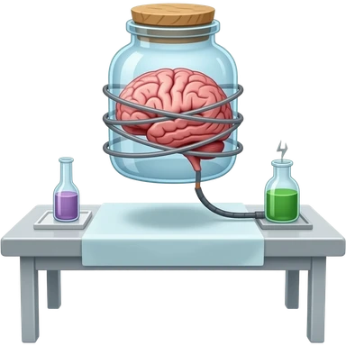 a brain placed in medical preparations that is connected to an electrical circuit, a glass jar wrapped in high-voltage wires floats above the autopsy table emoji