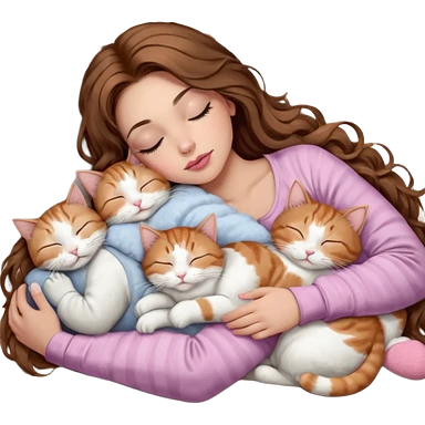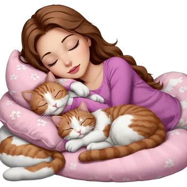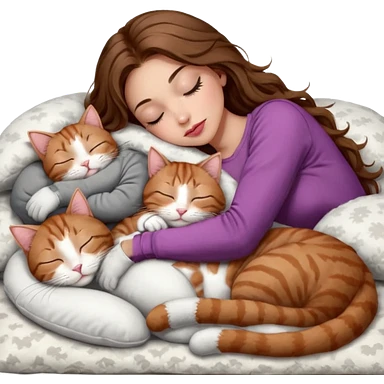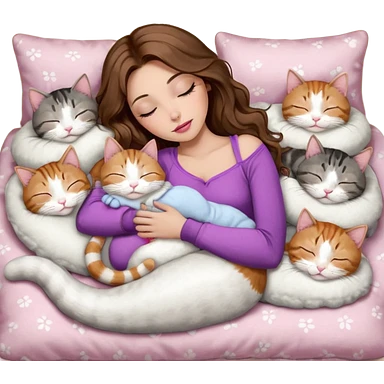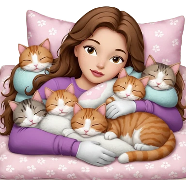 girl with long wavy brown hair, brown eyes, long lashes makeup, sexy pink lips, light to medium complexion, sleeping on a cozy pillow, with 6 cats: 1 brown and white tabby cat, 1 ginger and white, 2 grey and white, 1 grey with white mittens and small white patch on chest and 1 calico, sleeping emoji