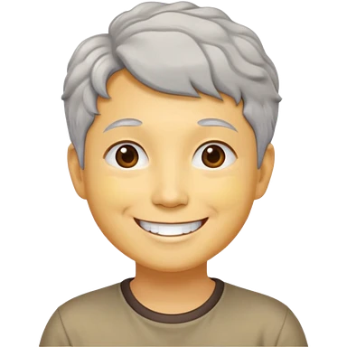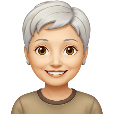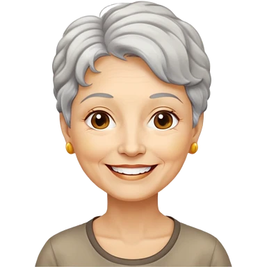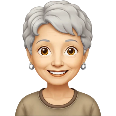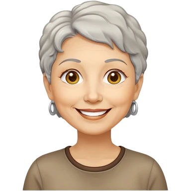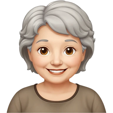 Bà lão 60 tuổi, da vàng, mặt tròn, tóc ngắn màu bạc, mặt cười tươi vui vẻ, áo nâu emoji