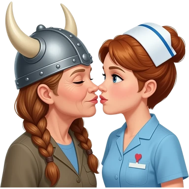 Viking helmet older woman with gray braids kissing shortest brown hair nurse couple emoji