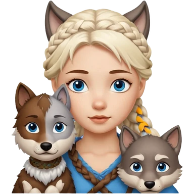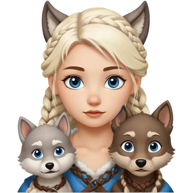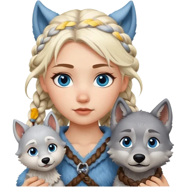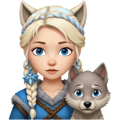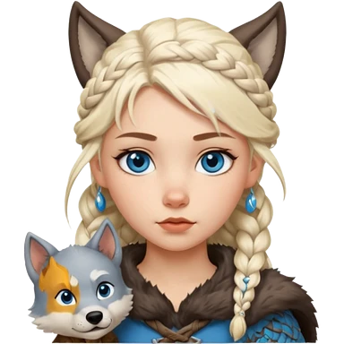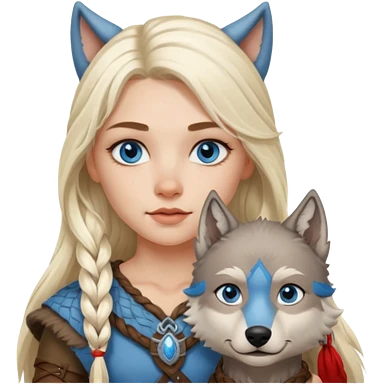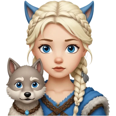 Viking platinum blonde girl with braid and blue eyes. Wolf pet emoji