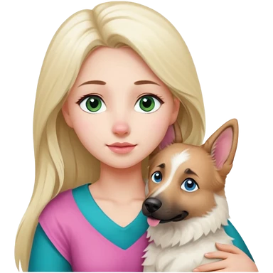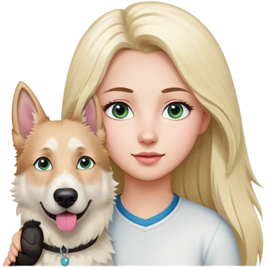 White European young woman with blue-green eyes and long blond hair with her white German Shepherd dog,the Dog hast a pink nose and short fur and Brown eyes emoji