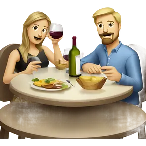 Repas raclette et vin blanc en couple, femme blonde cheveux aux épaules homme petite barbe et moustache cheveux bruns grisonnant emoji