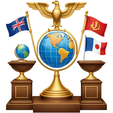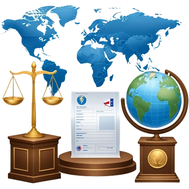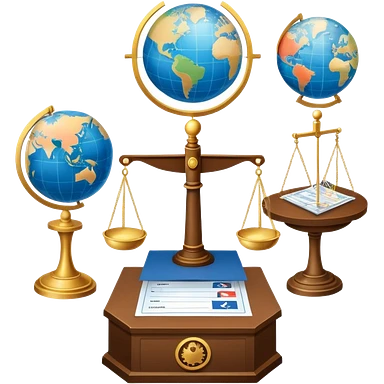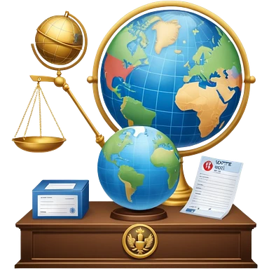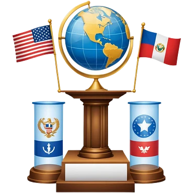 An icon featuring a podium with a speaker, national flags, and voting ballots, symbolizing political science. The design includes a globe and scales of justice in the background, representing governance, global affairs, and political theory. Transparent background emphasizes civic engagement emoji