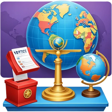 An icon featuring a podium with a speaker, a ballot box with a voting slip, and a globe, symbolizing political science. The design includes scales of justice and a world map in the background, representing governance and global politics. Transparent background highlights political analysis. emoji