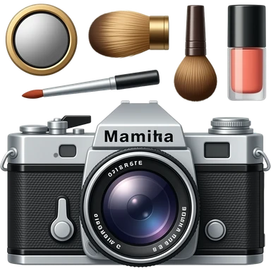 vintage composition of make-up accessories with photo-camera Mamiya RB67 emoji