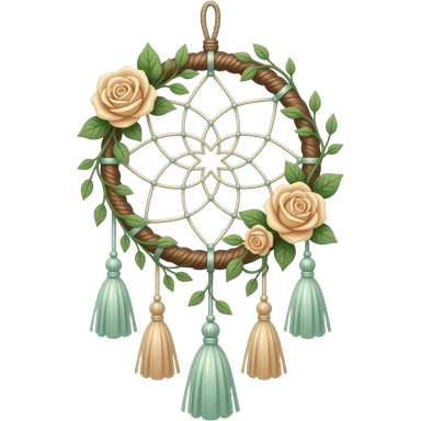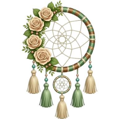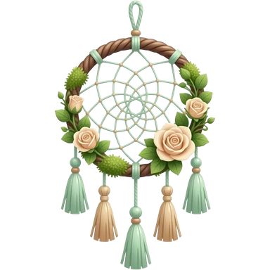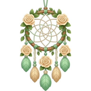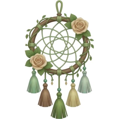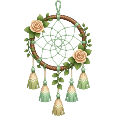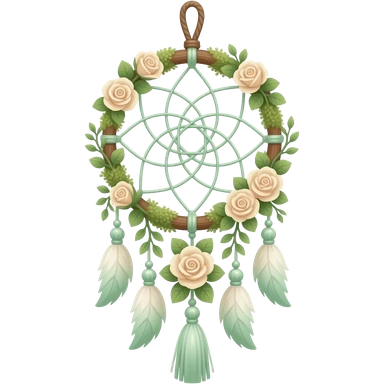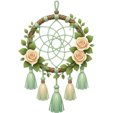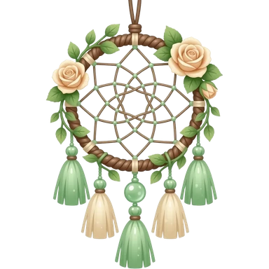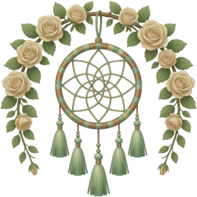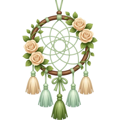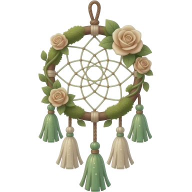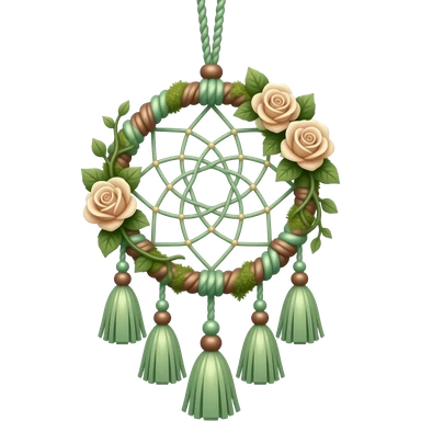 Hippie-like Cute dainty neat Pastel Green-white-brownish-beige-gradients thread-rope-hanging dreamcatcher, pastel colors, whitish, light, green academia aesthetic, mossy, with green vines and beige roses, Cottagecore, Princesscore, shiny glistening, vintage, tassels emoji