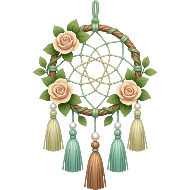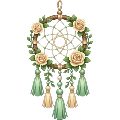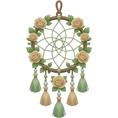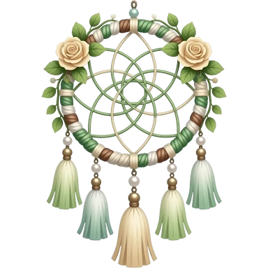 Hippie-like Cute dainty neat Pastel Green-white-brownish-beige-gradients thread-rope-hanging dreamcatcher, pastel colors, whitish, light, green academia aesthetic, mossy, with green vines and beige roses, Cottagecore, Princesscore, shiny glistening, vintage, pearls, tassels emoji