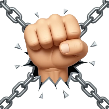 Vintage political poster graphic art style. Close-up of a powerful, clenching fist breaking thick iron chains. High contrast, dramatic lighting, bold lines, limited color palette of deep red, black, and white. Minimalist composition for maximum instant impact. emoji