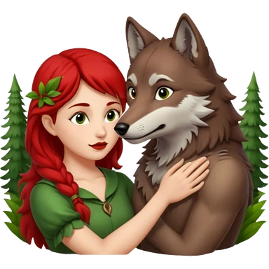 Caperucita roja acariciando la cabeza de un lobo macho en un bosque emoji