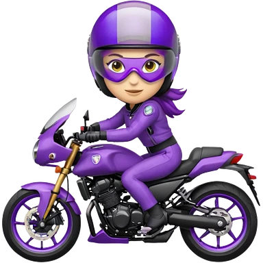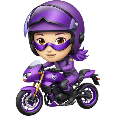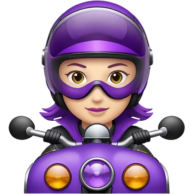 Créer un emoji avec une moto mt07 sport noir mate / violet iridescent très foncé, pare-brise de la moto violet. Avec une femme pilote dessus, visage masqué par la visière violette . Avec en arrière plan cercle violet. emoji