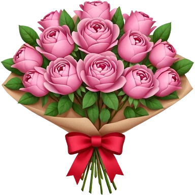 Bouquet of pink flower like rose and peony wrapped in kraft paper with red bow emoji