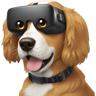 funny dog wearing a black hoodie with "OMG" letters on it and VR headset in a cyberpunk VR environment with violet neon lighting. emoji