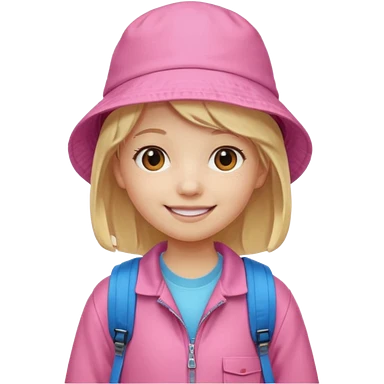 A student white skin, blonde hair, with pink bucket hat, orange jacket, blue backpack emoji