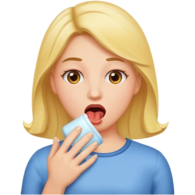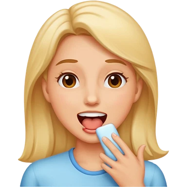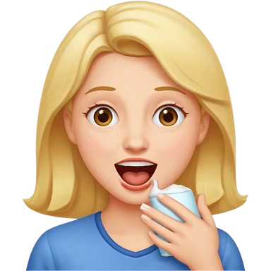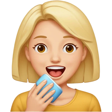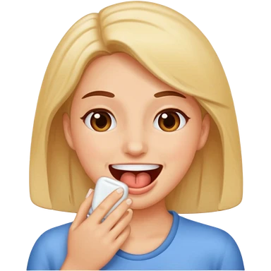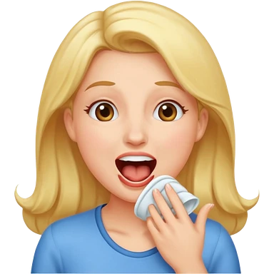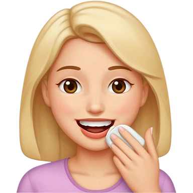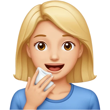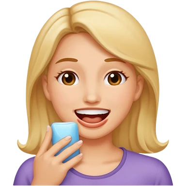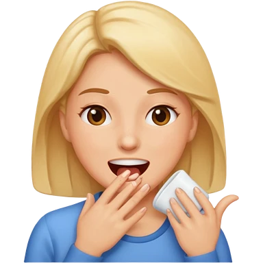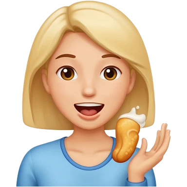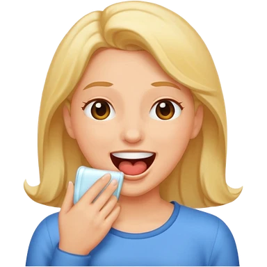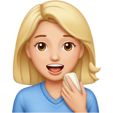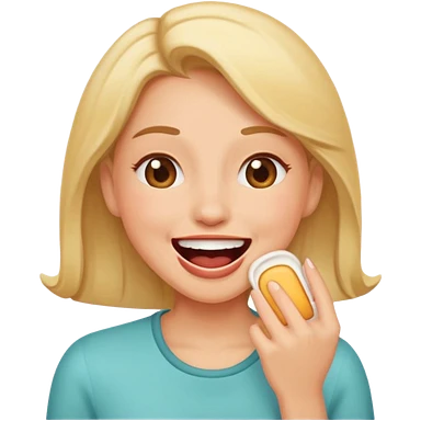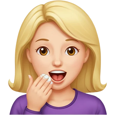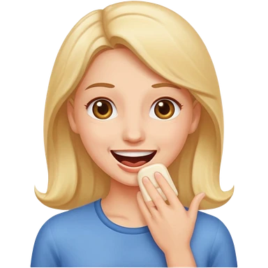 woman with long curly blond hair, brown eyes, wearing an off-shoulder top, studying emoji