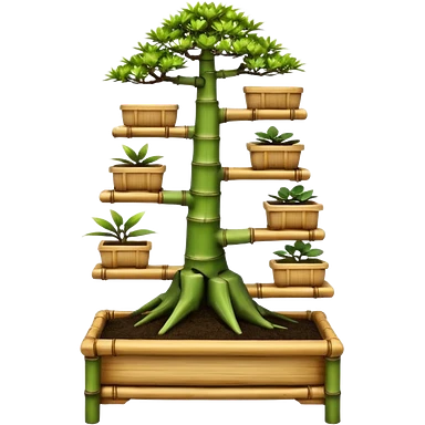 Wide Three tiered bonsai planters stand, shelving holding nine specimens and several small ones , frame made of one inch thick bamboo emoji
