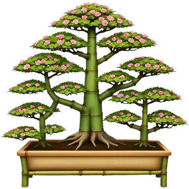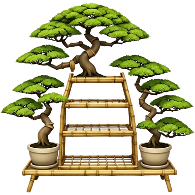 Wide Three tiered bonsai planters stand, shelving nine maple specimens and several smaller azaleas, frame made of one inch thick bamboo emoji