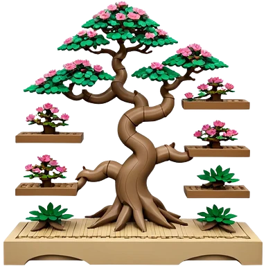 Wide Three 7-tiered Lego bonsai stand, shelving nine maple specimens and several smaller azaleas, frame made of oaken palette wood emoji