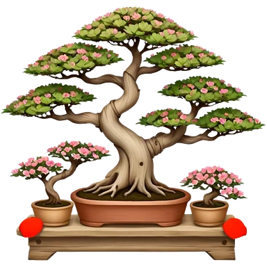 Wide Three tiered bonsai stand, shelving nine maple specimens and several smaller azaleas, frame made of oaken palette wood emoji
