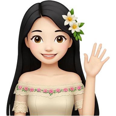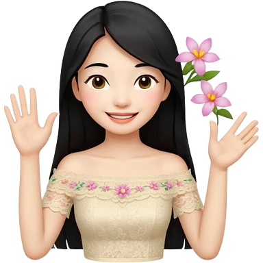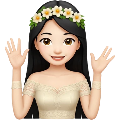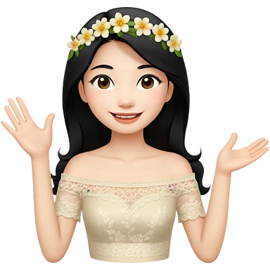 beautiful happy Thai woman with long straight black hair, fair skin, smiling gently while doing Thai greeting gesture (wai), wearing a cream lace off-shoulder blouse, hair decorated with flowers, pastel background, emoji style illustration emoji