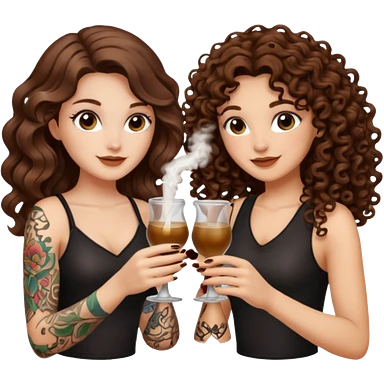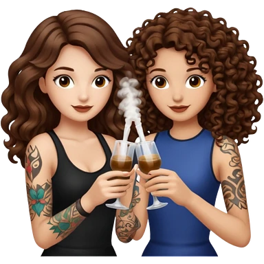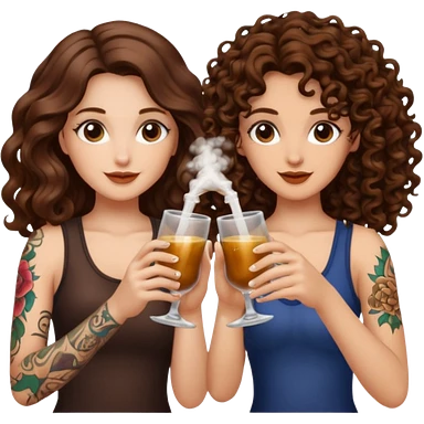 warm potion break — long wavy brown hair tattooed woman and short tight curly brown hair woman — hugging glowing mug emoji | AI Emoji Generator