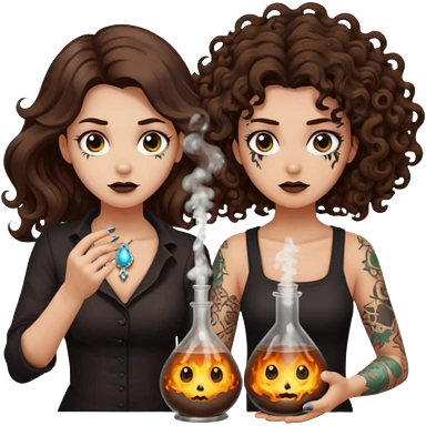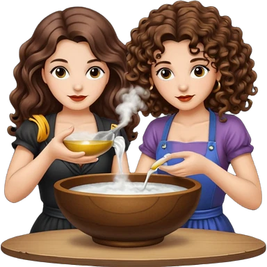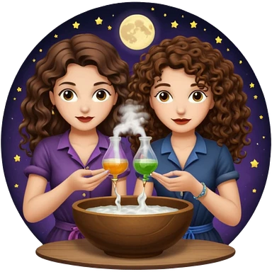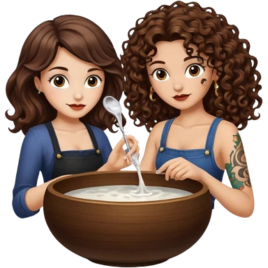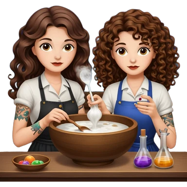 moon bowl mixing — long wavy brown hair tattooed woman and short tight curly brown hair woman — potion scene emoji