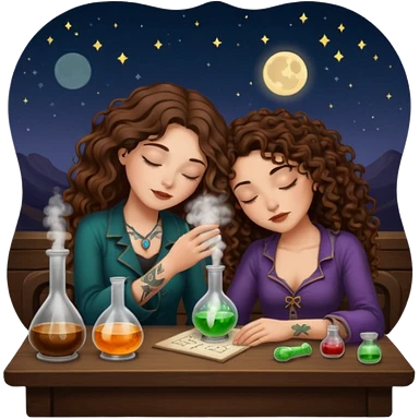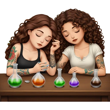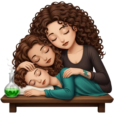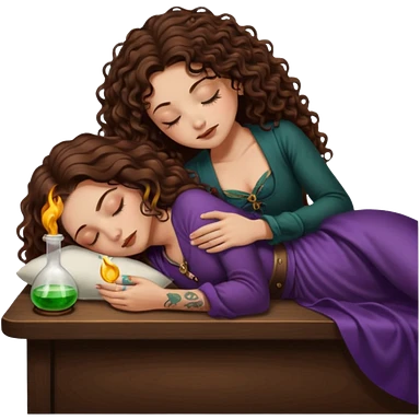 potion lab nap — long wavy brown hair tattooed woman and short tight curly brown hair woman — asleep at alchemy table emoji