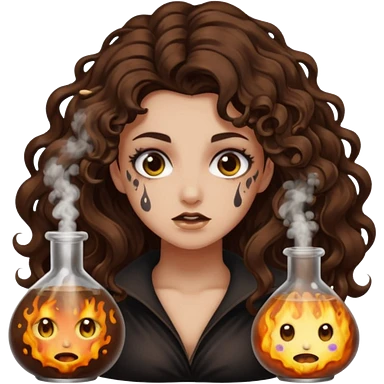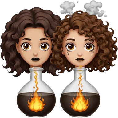 alchemy accident — long wavy brown hair tattooed woman and short tight curly brown hair woman — potion explosion soot faces emoji