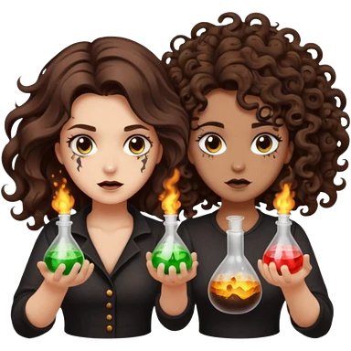 potion combo success — long wavy brown hair tattooed woman and short tight curly brown hair woman — vial connect emoji