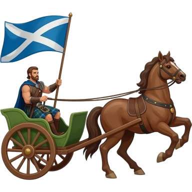 Warrior driving chariot wearing red tartan kilt with long brown flowing hair carrying a Scottish flag, pulled by a grey horse emoji | AI Emoji Generator