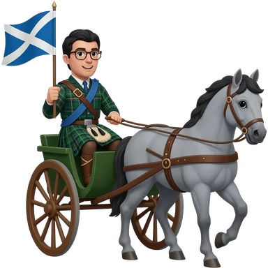 Warrior driving chariot wearing highland dress carrying a Scottish flag, wearing glasses pulled by a grey horse emoji