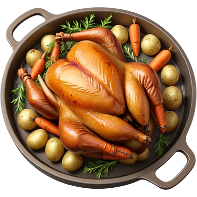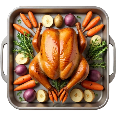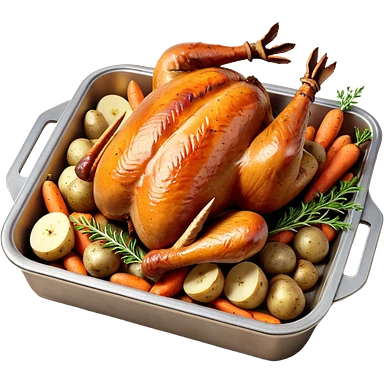 roasted turkey in a baking tray, golden brown crispy skin, whole turkey surrounded by vegetables, oven-baked meal presentation, juicy texture, warm food lighting, 3D cartoon style, mobile game icon style, centered composition, clean background, no text, no watermark emoji