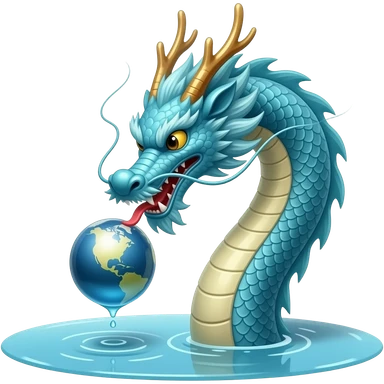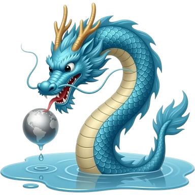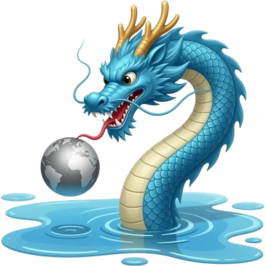 A long blue Chinese serpentine dragon emerges from a puddle of water, hovers above the surface, playing with a silver planet. emoji