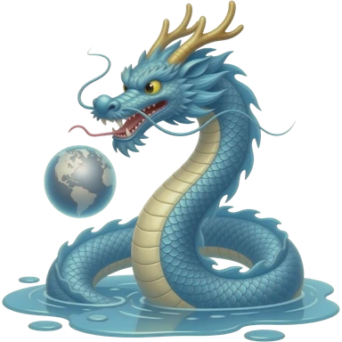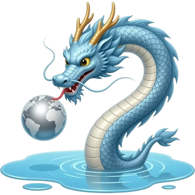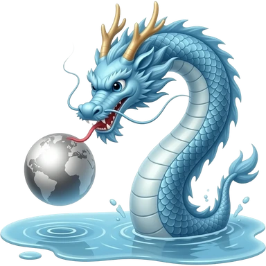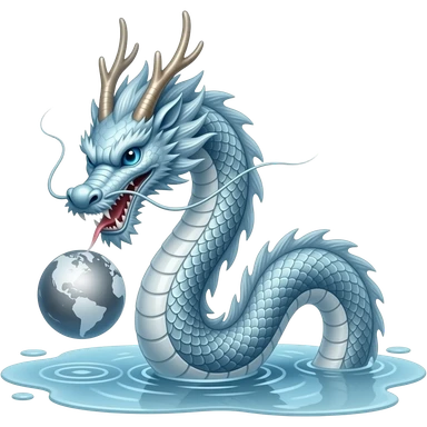 A long silver-blue Chinese serpentine dragon emerges from a puddle of water, hovers above the surface, playing with a silver planet. emoji