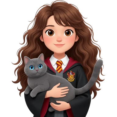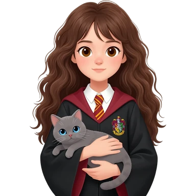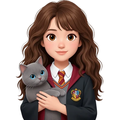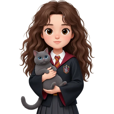 A Girl with long wavy brown hair, with grey-blue eyes, has a light pink bow on hair, and coquette clothes. She is holding a grey cat, which has a pink bow too. emoji