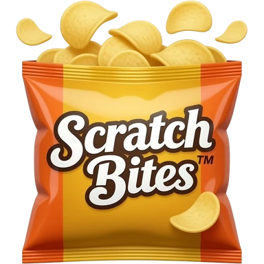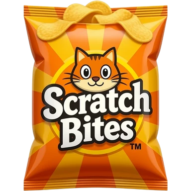 a colorful chip bag with a fun cartoon style, bold logo that says, “Scratch Bites™”, orange and yellow colors, shiny plastic texture, slightly crinkled, with chips bursting out of the top, 3D emoji style. Make it like the coding website, "Scratch" with the Scratch Cat emoji