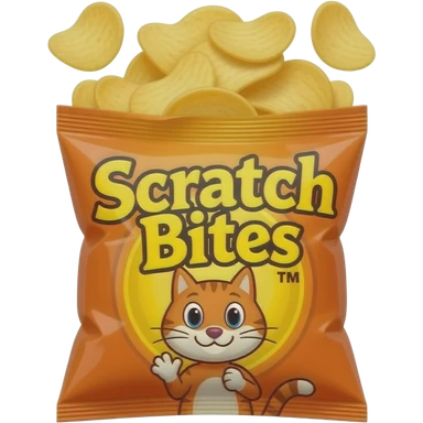 a colorful chip bag with a fun cartoon style, bold logo that says, “Scratch Bites™”, orange and yellow colors, shiny plastic texture, slightly crinkled, with chips bursting out of the top, 3D emoji style. Make it like the coding website, "Scratch" with the Scratch Cat. emoji