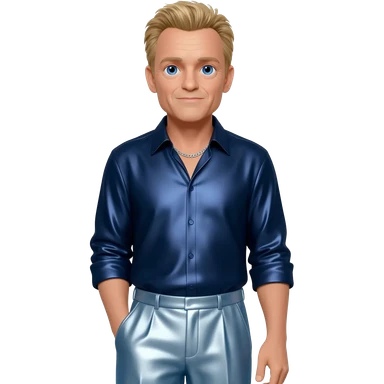 Jeff Daniels with blue eyes, sandy blonde hair, dark blue metallic shirt, light steel blue metallic baggy pants, silver necklace emoji