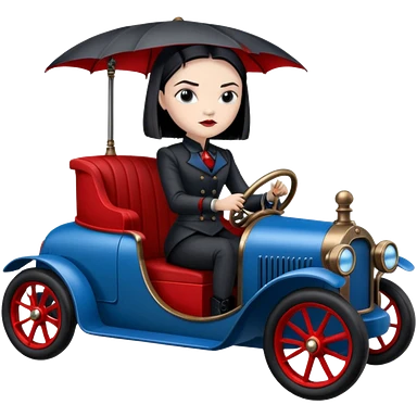 Wednesday Addams riding in a bright steampunk electric wagon emoji