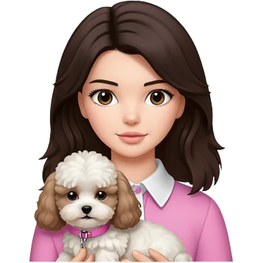 brunette Kendall Jenner with long hair holding on the hands white maltipoo wear on pink collar emoji