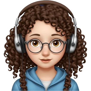 brunette kid with unique face features and very curly long hair kid girl neutral and big glasess and big nose and dark eyes with freckles kind of nerd looking and headphone wearing emoji