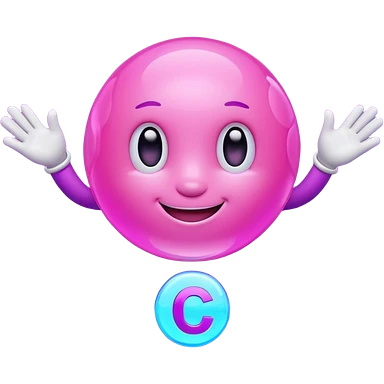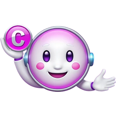 Friendly round AI mascot with a neon C badge, floating hologram in hands, purple-magenta glow. emoji