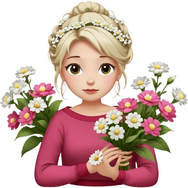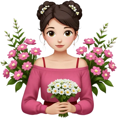 a girl sitting near various bouquets of flowers , white and pink flowers . She is holding a single white flower up to her face, Her hairstyle is slightly messy updo, with a few soft strands falling around her face, . She wears a red off-shoulder cardigan and a white long skirt. emoji