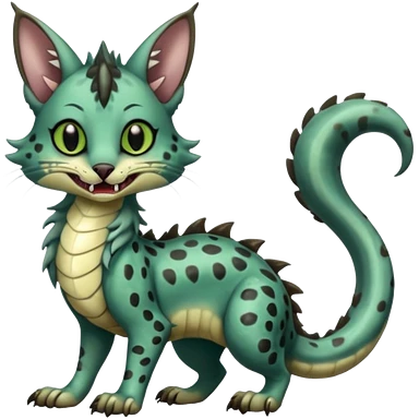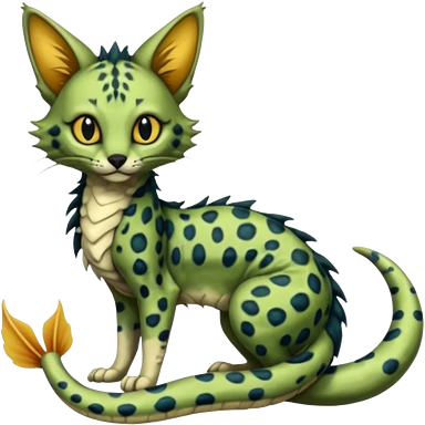 Realistic cute swampy greenish dark edgy spooky Flurry furry scary slimy oily glossy wet gloomy dusky scaly sergal-serval-possum-sphynx-Koi-sergal-fusion-animal-hybrid-creature with a snake-tail emoji