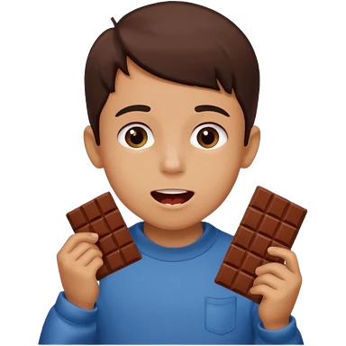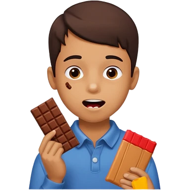 A boy holding a chocolate bar with him chewing on the bite he took emoji