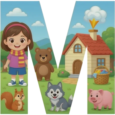what a cartoon on the letter M 👧🏼🧣🐻💥🏠🧺🐿️🐺🐷 emoji
