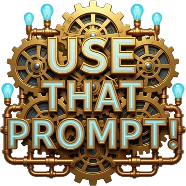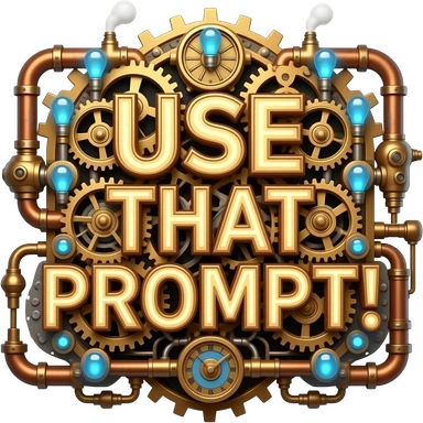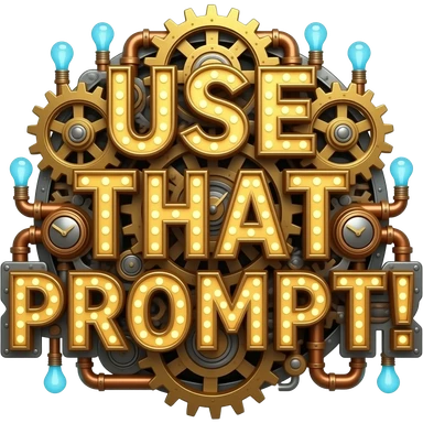 A complex glowing Steampunk text 'USE THAT PROMPT!' constructed from interlocking brass gears, copper pipes, and tiny hissing steam vents. Small glowing blue Edison bulbs attached to the frame, mechanical clockwork style, highly detailed textures emoji