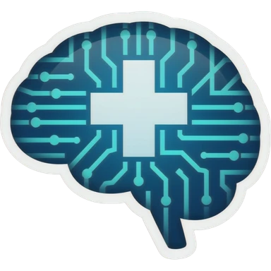 "Sticker of a digital brain merged with a medical cross and circuit lines, vibrant blue and teal, flat vector style, thick white border, die-cut, professional medical AI design." emoji